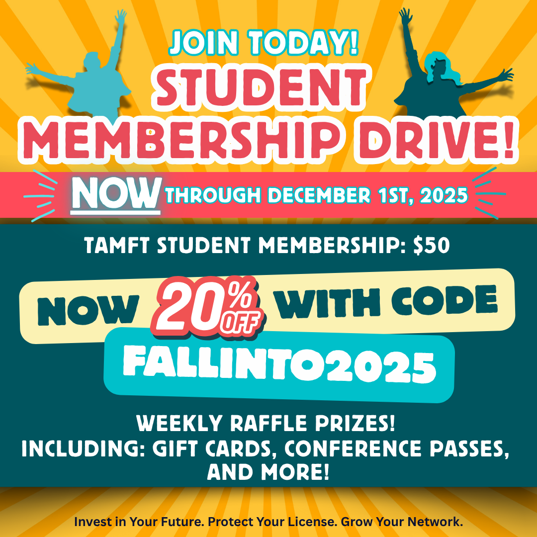 WELCOME STUDENTS!![]() SPECIAL OFFERFrom now through December 1, 2025, you can enjoy 20% off all new student memberships! Just use the code FALLINTO25 at checkout to receive your discount. Exciting Prizes and Giveaways: Join TAMFT during the drive, and you'll be entered into our weekly raffle for prizes like conference passes, gift cards, and more! We’ll announce winners on social media, so be sure to follow us on Instagram (@theTAMFT) and Facebook (Texas Association for Marriage and Family Therapy) for updates. Winners will also be notified via email. Spread the Word: Help your university receive special recognition by encouraging your fellow students to join— the school with the highest number of new student memberships will be celebrated at the end of the drive! Supervisors and Educators: Please share this initiative with your students and encourage them to participate. Join with Student MembershipJoin Why Join TAMFT?As a Student member, you’ll enjoy all the perks to get you ahead in your career, including: